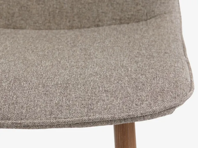 Spisebordsstol med polstret sæde og ryglæn i sandfarvet stof. Ben i stål med egetræslook.