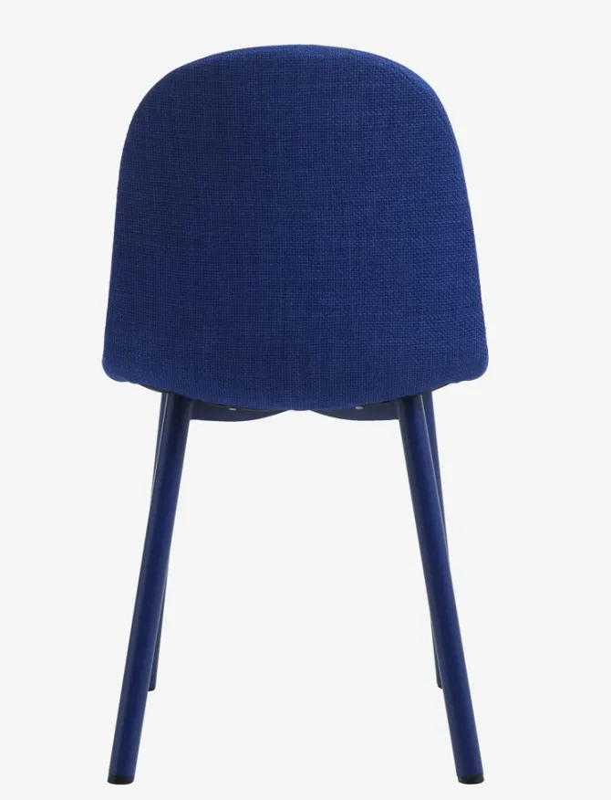 Spisebordsstol med polstret sæde og ryglæn i blåt stof. Matchende ben i stål.