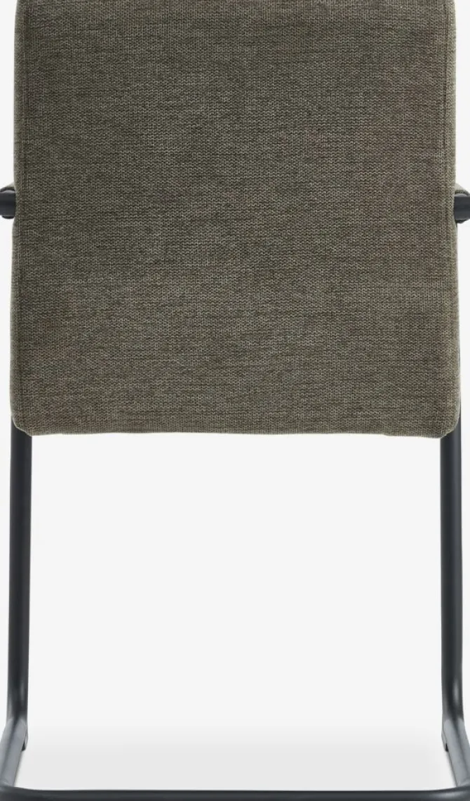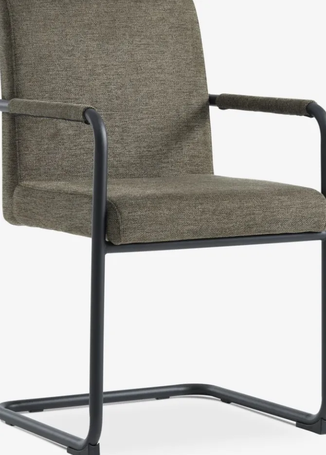 Spisebordsstol med armlæn, der giver ekstra støtte og komfort. Stolen har et polstret sæde og ryglæn i olivengrønt stof. Sort stel i stål.
