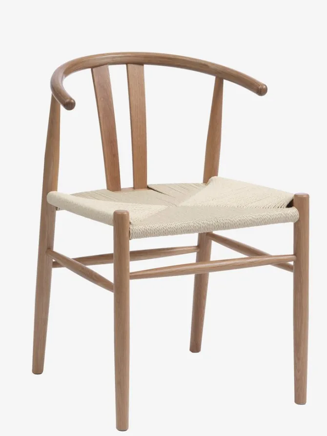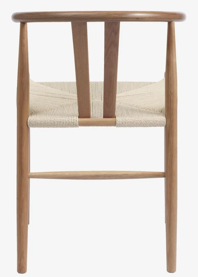 Spisebordsstol med sæde i vævet papirsnor. Stel i massiv eg med buet ryglæn. Træet er lakeret for at forlænge holdbarheden.