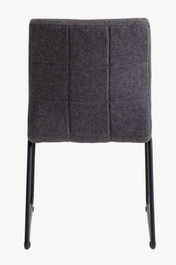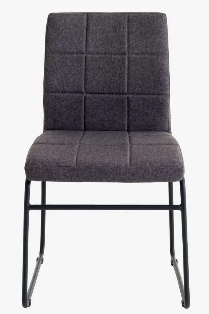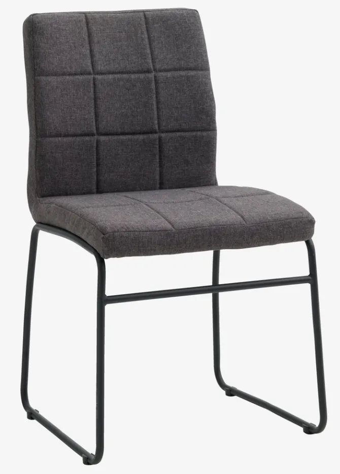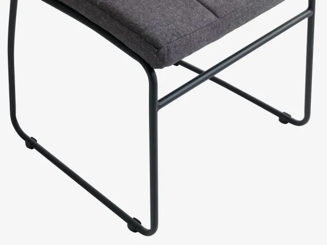 Spisebordsstol med polstret sæde og ryglæn i gråt stof. Sorte ben i stål.