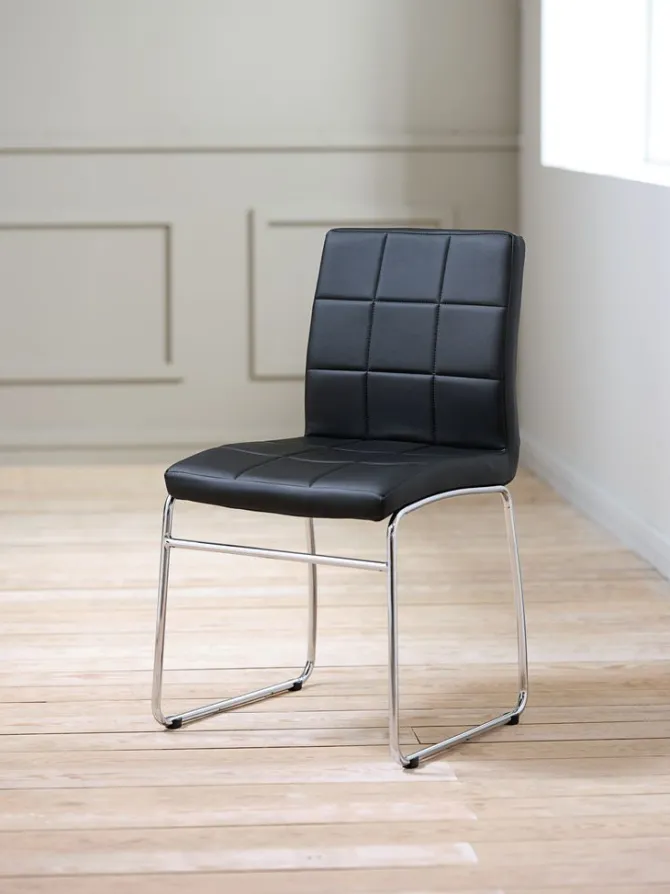 Spisebordsstol med polstret sæde og ryglæn i sort kunstlæder. Ben i krom.