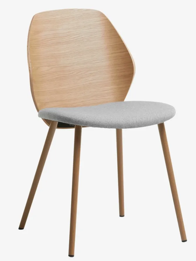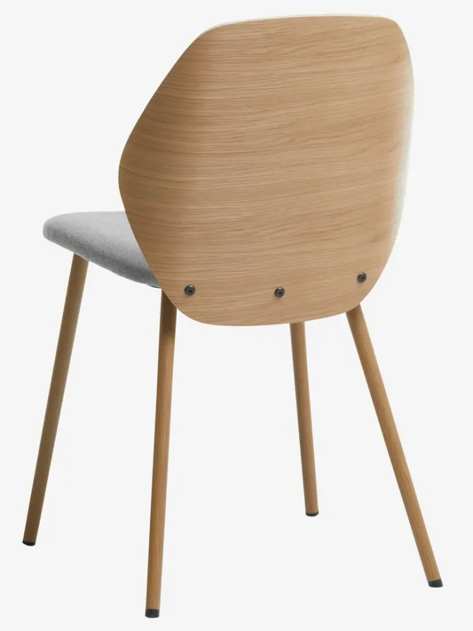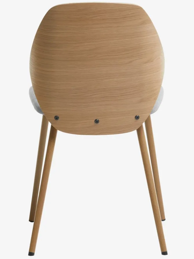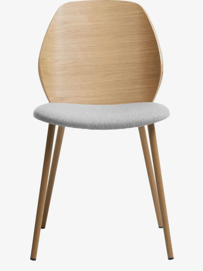 Spisebordsstol med polstret sæde i lysegråt stof og ryglæn i træfiner. Træet er lakeret for at forlænge holdbarheden. Ben i stål med egetræslook.