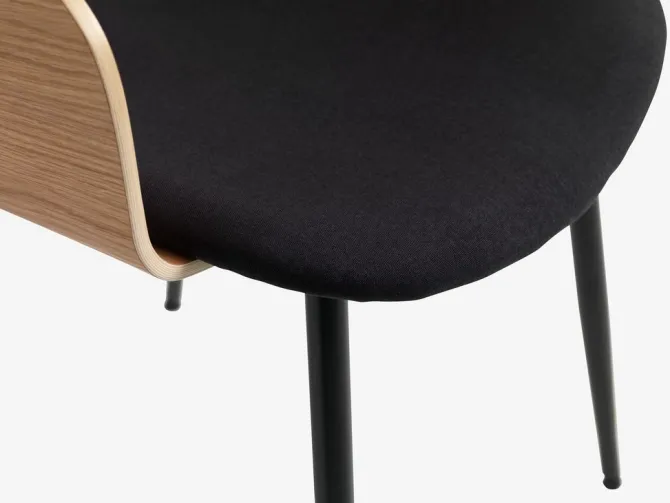 Spisebordsstol med armlæn, der giver ekstra støtte og komfort. Stolen har et polstret sæde i sort stof og et buet ryglæn i egefiner. Træet er lakeret for at forlænge holdbarheden. Sorte ben i stål.