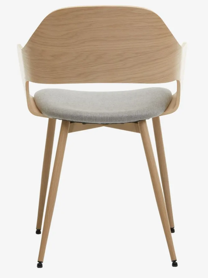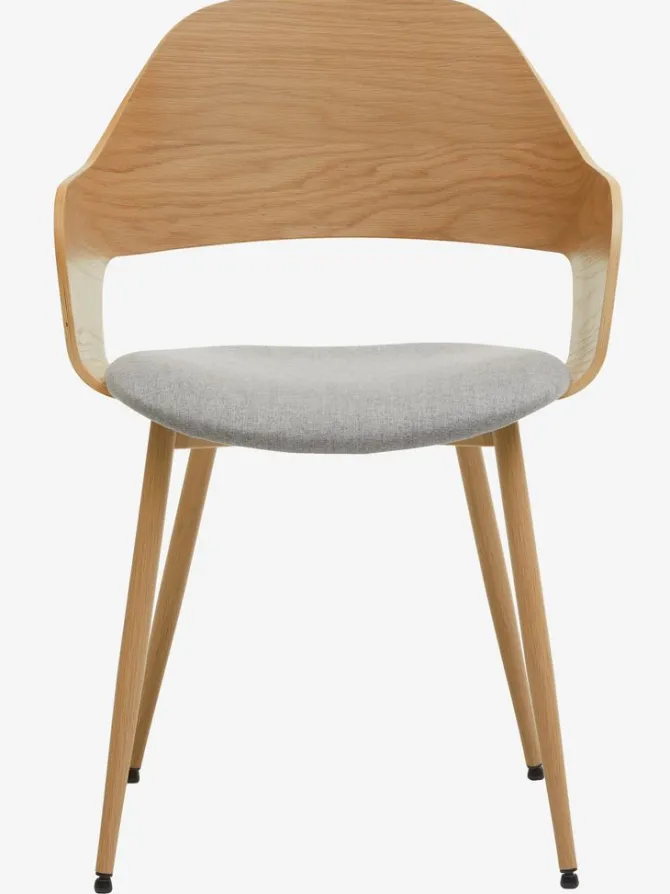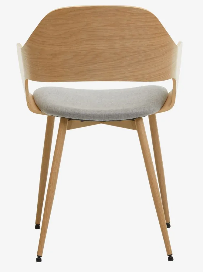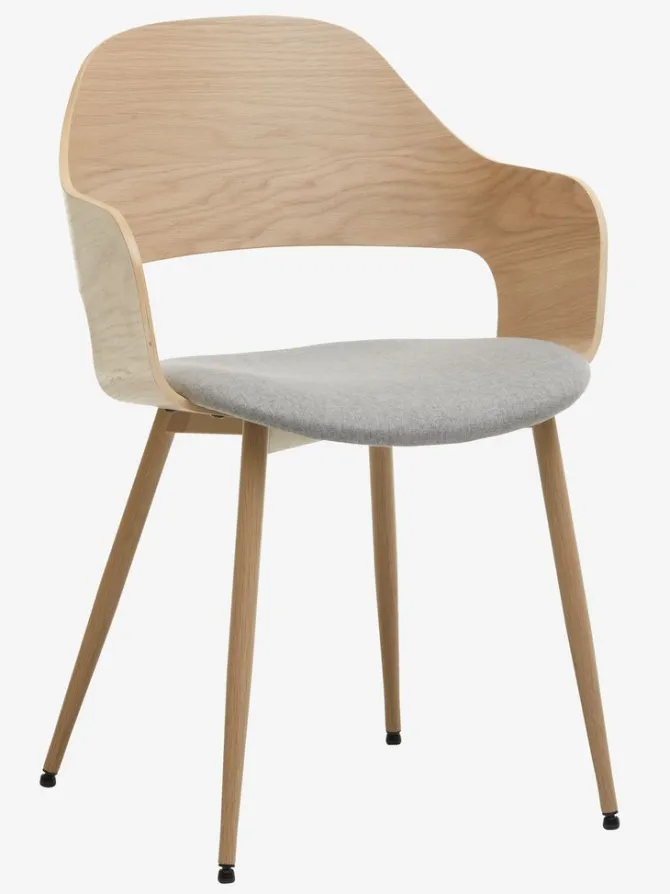 Spisebordsstol med armlæn, der giver ekstra støtte og komfort. Stolen har et polstret sæde i lysegråt stof og et buet ryglæn i lys egefiner. Træet er lakeret for at forlænge holdbarheden. Ben i stål med egetræslook.