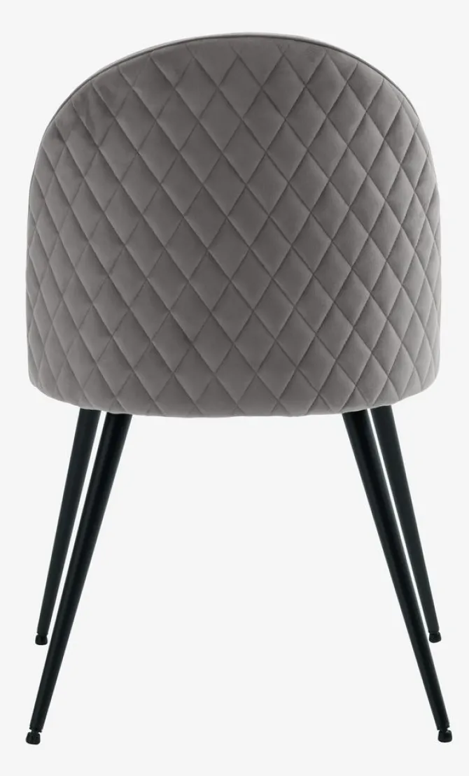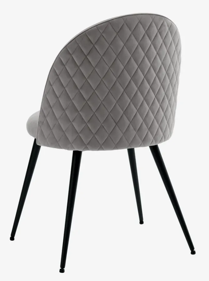 Spisebordsstol med polstret sæde og ryglæn i gråt fløjlsstof. Sorte ben i stål.