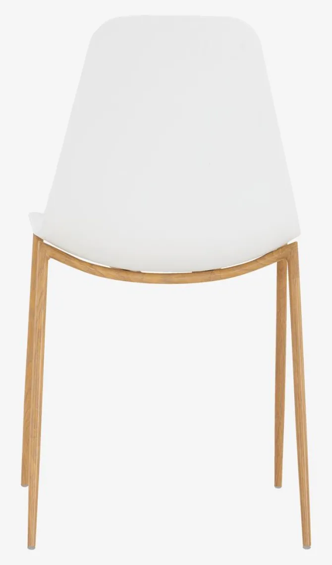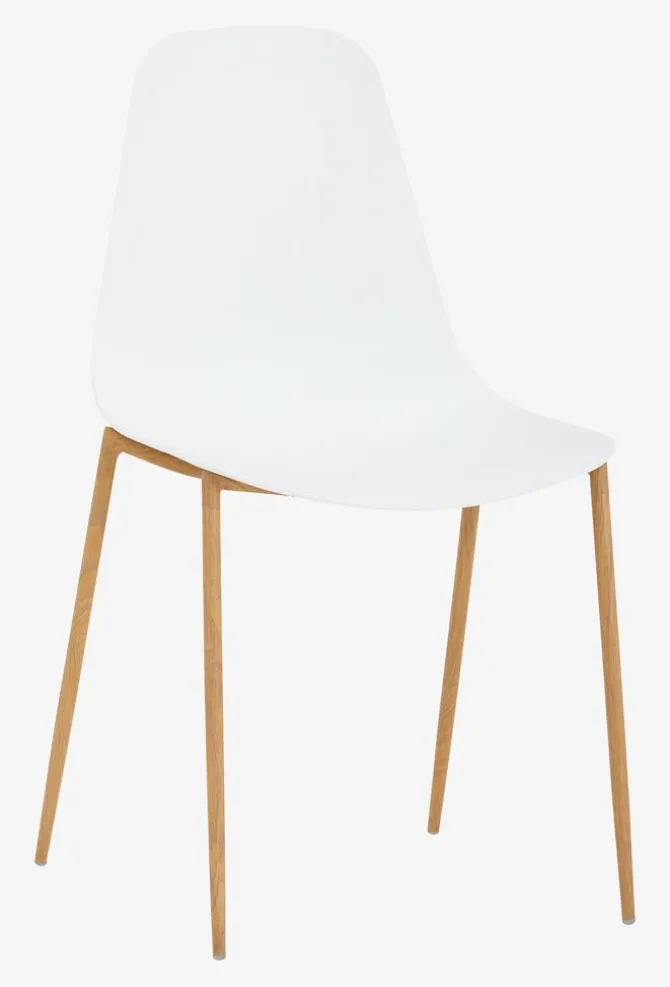 Spisebordsstol med hvidt formstøbt sæde og ben i stål med egetræslook.