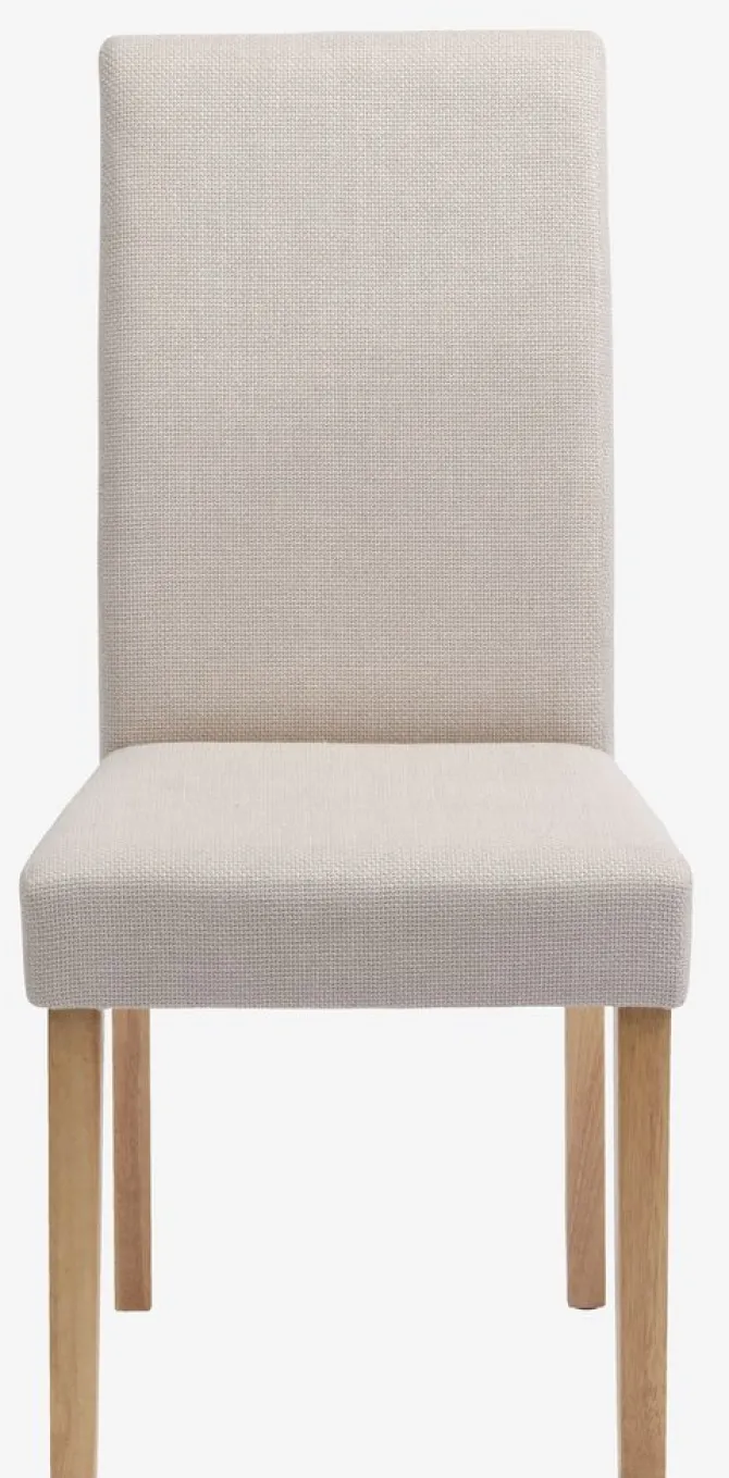 Spisebordsstol med polstret sæde og ryglæn i beige stof. Ben i massivt træ. Træet er lakeret for at forlænge holdbarheden.