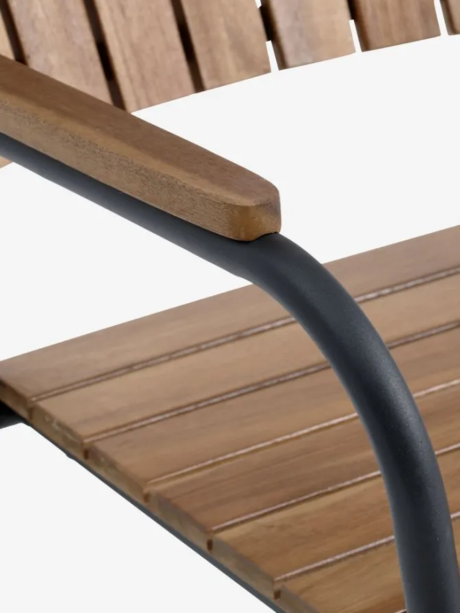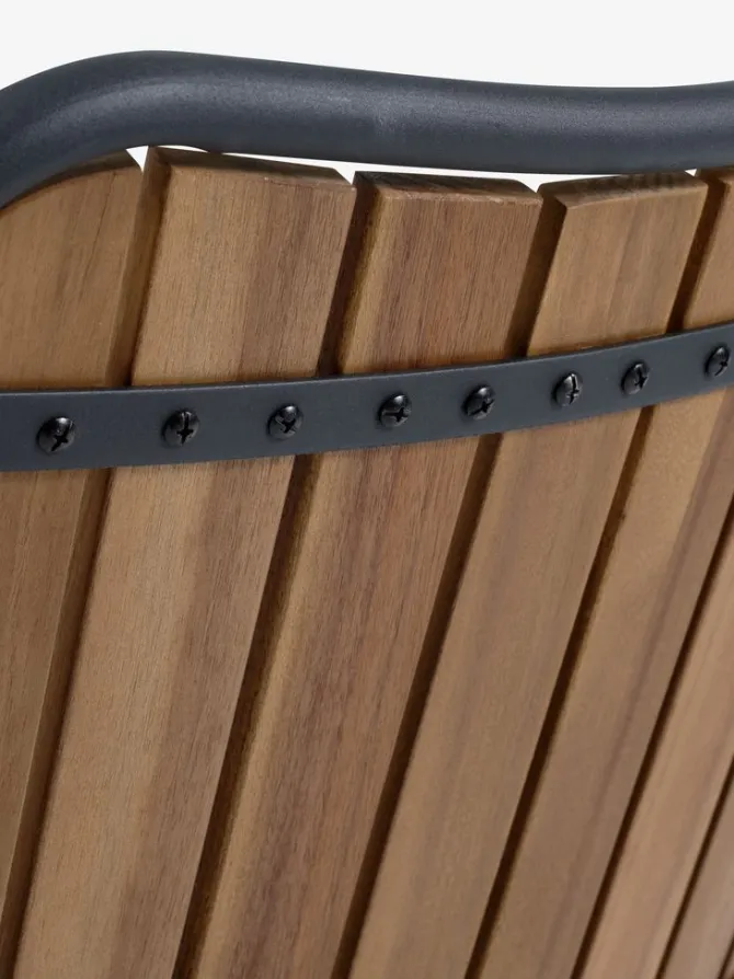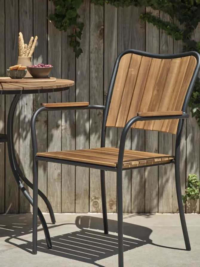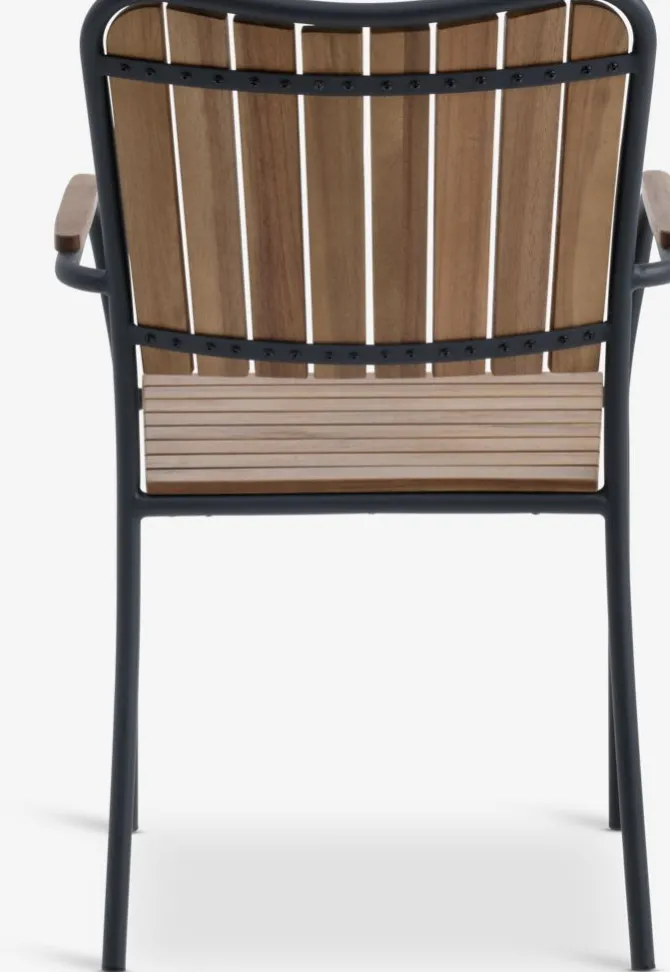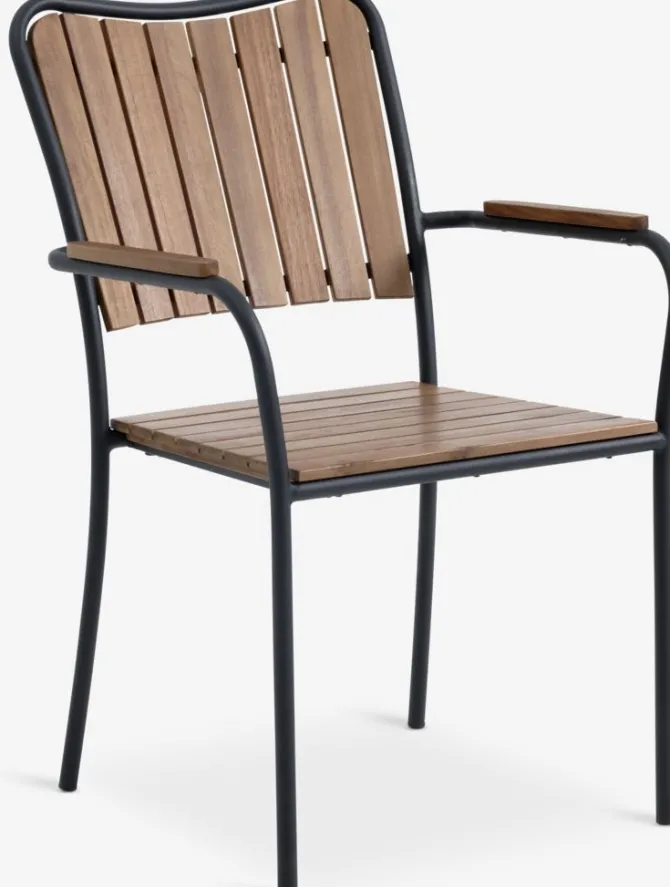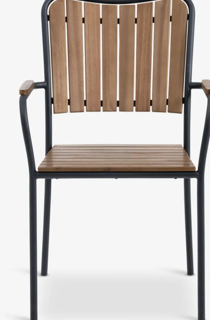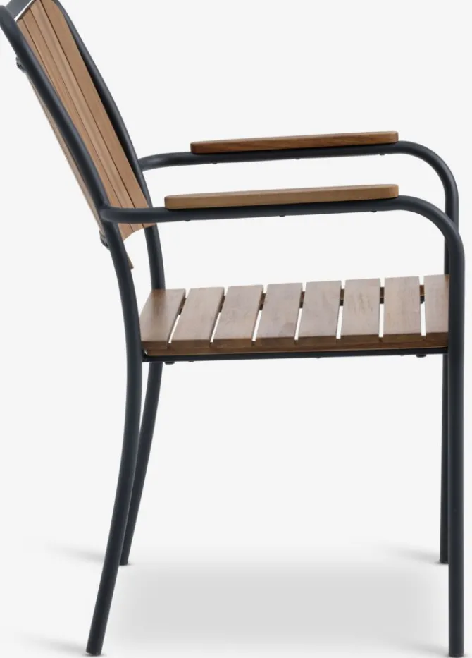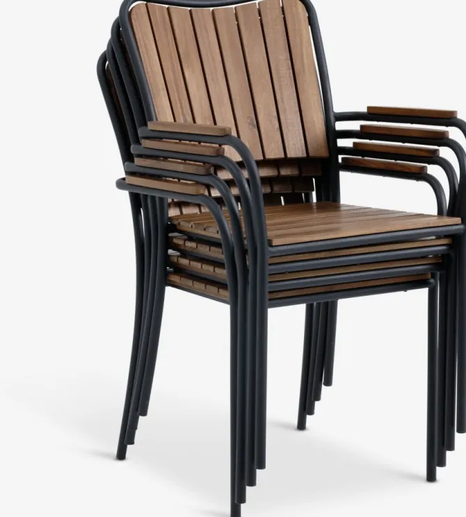Sort stabelstol med sæde og ryglæn i olieret FSC® hårdttræ. Stel i galvaniseret stål. Det slidstærke træ er behandlet med olie for at beskytte det og fremhæve dets naturlige farve. Regelmæssig oliering af træet anbefales for at bevare dets farve og beskytte det mod fugt. Galvaniseringen hjælper med at beskytte stålet mod slid og rust. Havestolen kan stables for kompakt opbevaring.