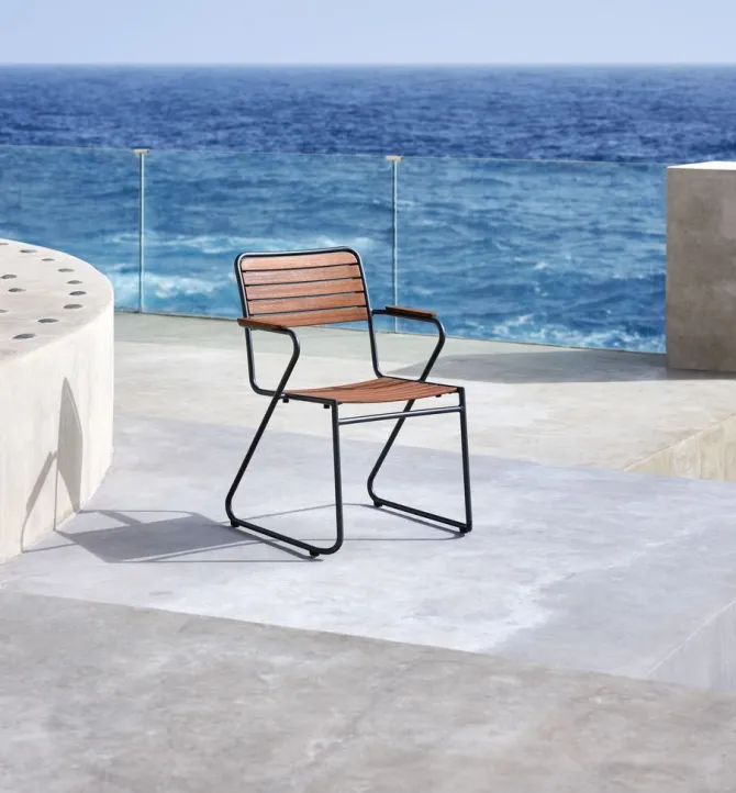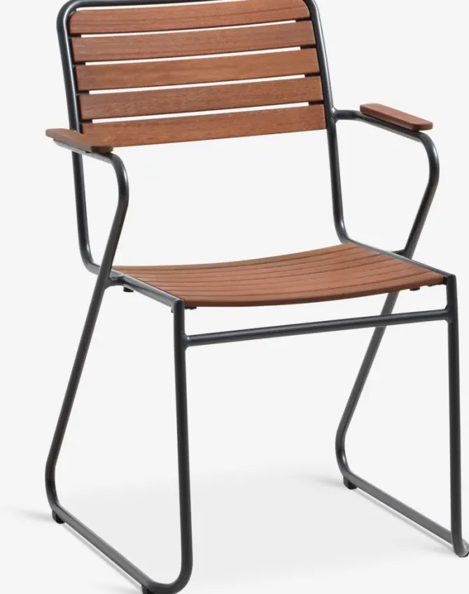 Stabelstol med sæde og ryglæn i olieret FSC-hårdttræ® og sort stel i pulverlakeret aluminium. Det slidstærke træ er behandlet med olie for at beskytte det og fremhæve dets naturlige farve. Regelmæssig oliering af træet anbefales for at bevare dets farve og beskytte det mod fugt. Aluminium er et let og robust materiale, der ikke ruster. Havestolen kan stables for kompakt opbevaring.