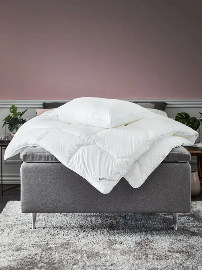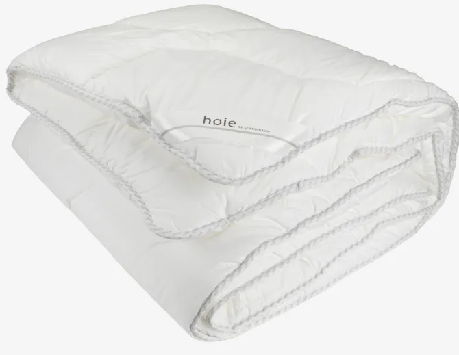 Allergivenlig termodyne 140×200 cm som består af 2 sammensyede dyner. Det isolerende luftrum mellem dynerne giver en jævn varme uden kuldebroer. Let, luftigt fyld af silikoniserede spiralformede hulfibre, 2×600 g. Blødt bolster i 100% bomuldscambric. Det tætvævede bolster begrænser støvmider i at trænge igennem. Vask 60°C. Inkl. opbevaringstaske.
