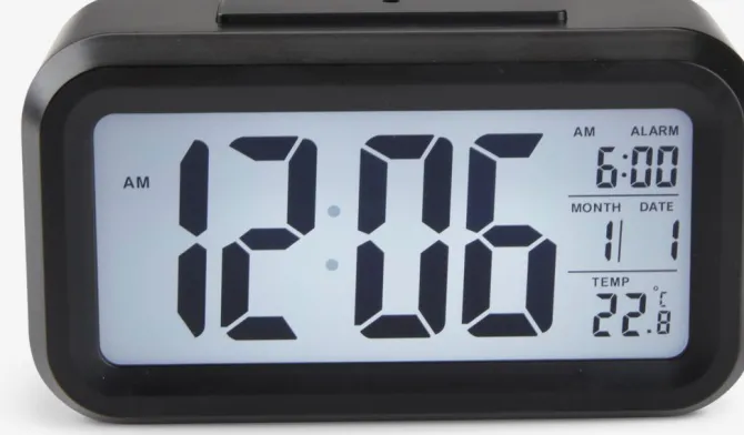 Sort vækkeur med et stort digitalt display, der viser tid, dato og temperatur. Uret har en alarmfunktion, som er nem at indstille, og det bruger 3 AAA-batterier (medfølger ikke). Det kompakte design gør det ideelt til natbordet eller skrivebordet. B14 x L5 x H8 cm