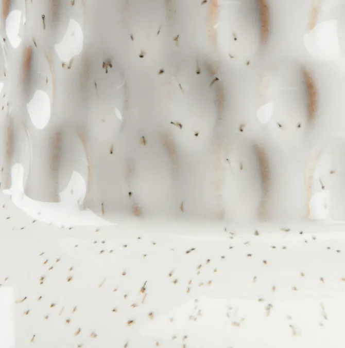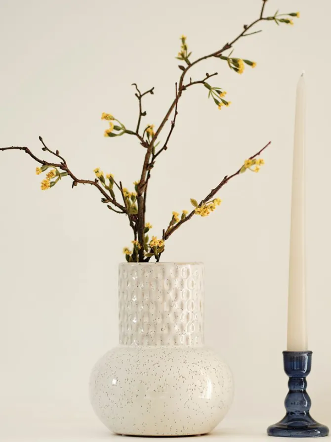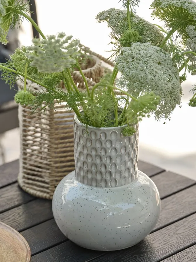 Råhvid vase i stentøj med unik struktur og glaseret finish. Vasen har en rund bund og en tekstureret hals, der tilføjer en visuel interesse og et moderne touch. Perfekt som en dekorativ genstand eller til at fremvise dine yndlingsblomster. Ø15 x H18 cm